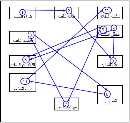 The workplaces seem tidy, but this did not prevent the customer from moving from here to there and back, as is evident from the crossed lines. Can you think of a way to improve the process? Can some departments be moved to better places, such as moving the packaging department next to the card delivery department? Is it possible to combine some operations, such as merging the application with its examination? Can the application be checked once? Is it possible to integrate some steps using information technology, such as replacing the file verification process by providing files electronically to the application examination employee? Can any of these steps be done in advance, such as buying and writing an order? Can any of these steps be taken later, such as sending the card to the customer by mail? These solutions differ according to the nature of the process, but the important thing is that we think of solutions to develop the process and reduce its time and thus provide better service to the customer. This chart may be used to study the internal services within the organization or the administrative processes such as the process of approving a purchase request or the employee submitting a request for treatment.